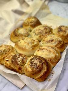 Pasada la hora, desgasificar y dividir la masa en dos (acá se pueden hacer dos rellenos diferentes, uno con mermelada, otro con jamón queso, o a gusto personal).